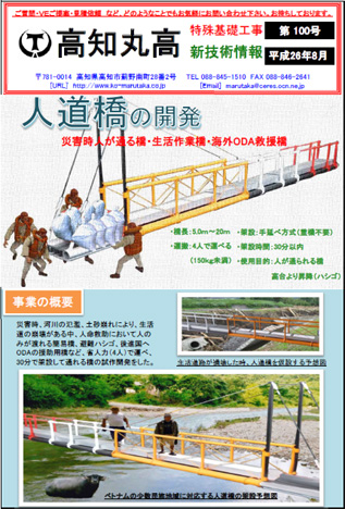 多様な ニーズに応える人道橋の開発。,災害時、河川の氾濫、土砂崩れにより、生活道の崩壊がある中、 人命救助において人のみが渡れる簡易橋、避難ハシゴ、後進国へODAの援助用橋など、省 人力(4人)で運べ、30分で架設して通れる橋のご紹介。 第100号の記事はこちら