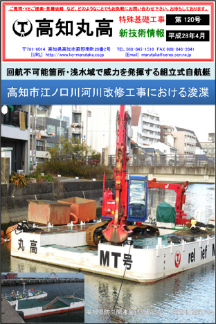 「回航不可能箇所・浅水域で威力を発揮する組立式自航艇 高知市江ノ口川河川改修工事における浚渫」及び「都市型可変式超高周波バイブロフォンサーの活躍 地震高潮第8-2号 下田川(排水機場)地震高潮対策工事」についてのご紹介!! 第120号の記事はこちら